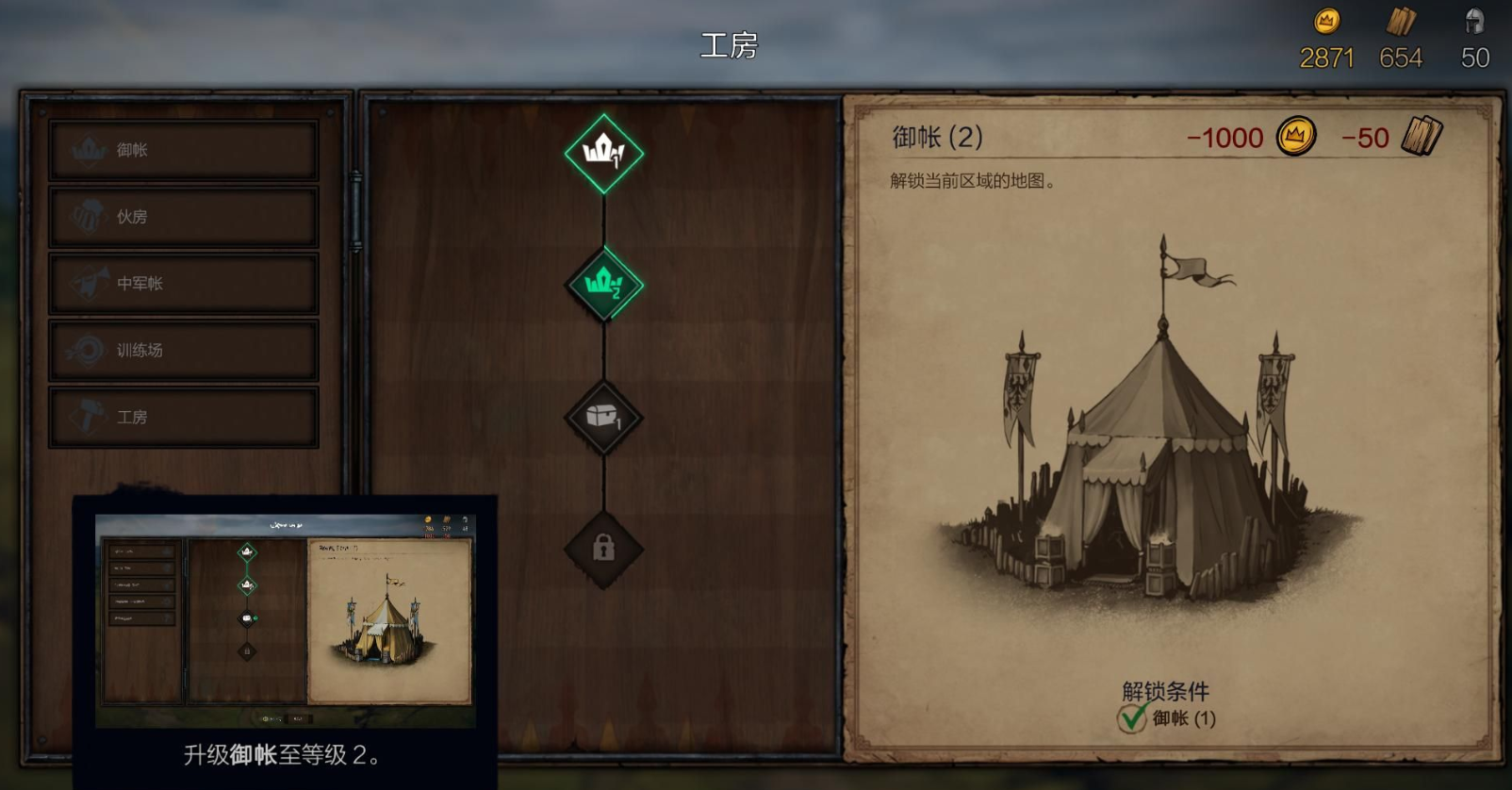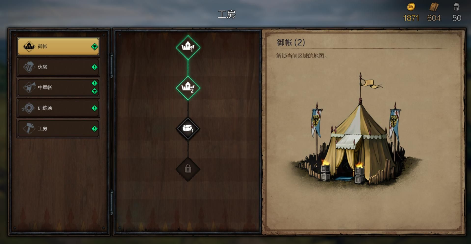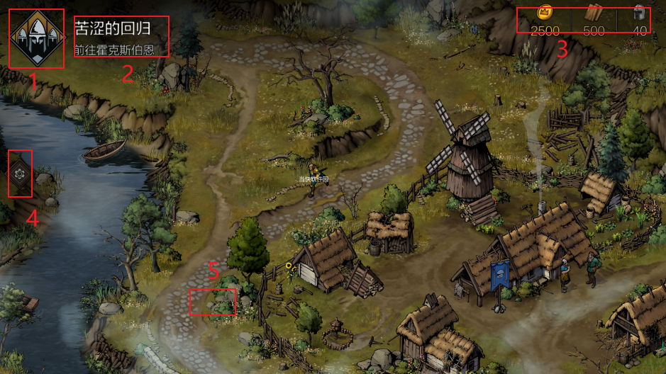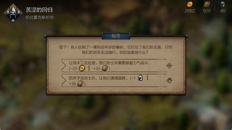 例如可雇佣伐木工(花费金钱,获得较多木材),或指派士兵清理(降低士气,获得少量木材)。考虑到初期木材与士气的重要性,推荐选择前者。