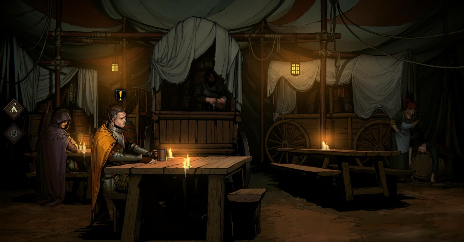伙房是与NPC互动的重要场所,可触发支线甚至主线剧情。此外,点击紫袍刺客可查看游戏总时长、挑战记录等数据。