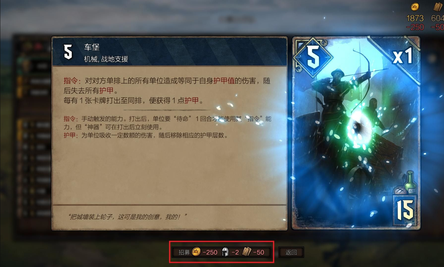 合成所需费用显示在卡牌下方红框内。例如“车堡”卡战力为5,人口消耗为15。通常而言,高人口消耗的卡牌具备更强战力或特殊效果。