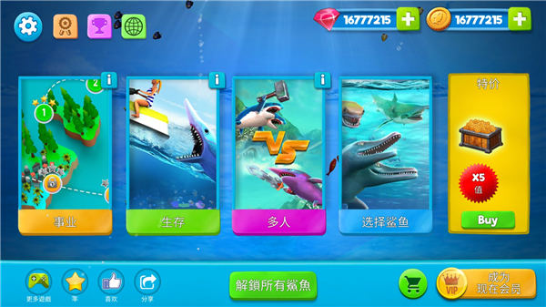 解锁超过10种不同类型的鲨鱼,体验多样进化路线。