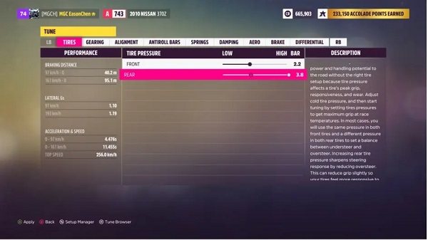 最后一步,将后轮胎压调至最高值,一台基础漂移车便已准备就绪。
