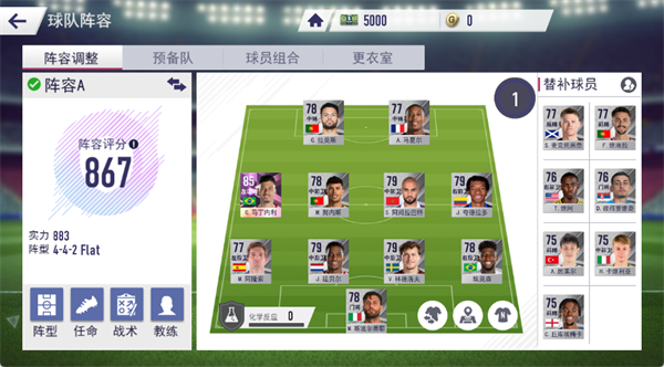 管理球队阵容,可调整阵型(如4-4-2 Flat)、进行球员任命、制定战术和选择教练,同时关注阵容评分与化学反应,优化球队战力。