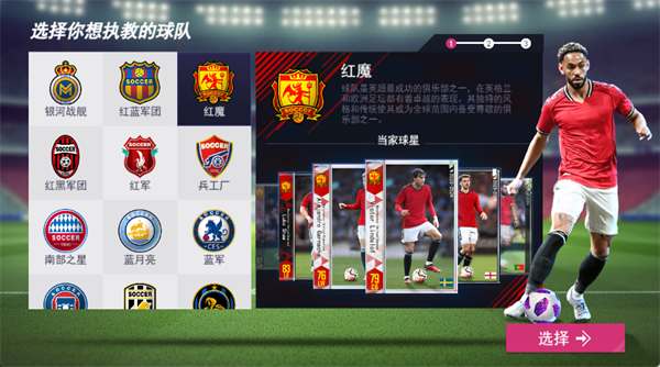 选择你想执教的球队,可挑选如“红魔”等风格各异的球队,不同球队有独特当家球星和背景,选队时可结合自身对球队风格的偏好来决定。