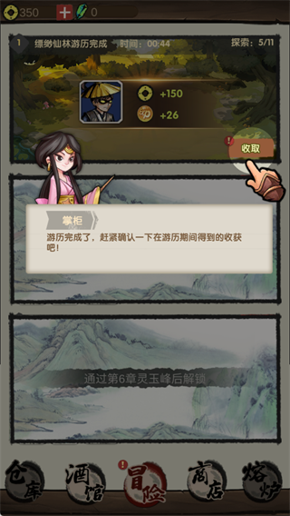 冒险游历完成后,可点击“收取”获取金币、经验等奖励,奖励数量与游历时间和探索进度相关。