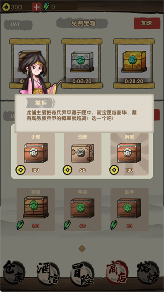 商店中掌柜会提供不同部位的宝箱,宝箱越豪华,开出高品质兵甲的概率越高,可花费金币或绿宝石购买,同时还有免费宝箱可定时领取。