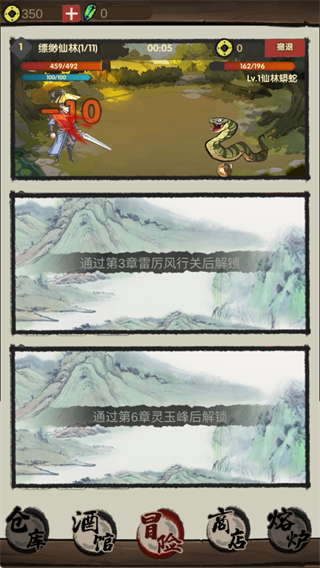 在冒险场中挑战山林蟒蛇等怪物战斗,通过章节解锁可开启更多地图,战斗中需关注自身生命和怪物血量,适时选择撤退或进攻。
