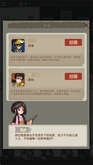 可招募“剑鬼”司龙和“魔枪”陶小超,两位均是名门出身的江湖人士,可根据战斗风格选择招募。