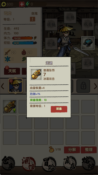 获得装备后,可查看其属性,满足等级要求即可装备,提升角色战力,同时可对装备进行分解或整理。