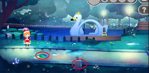 3、仍在天鹅船区域,拾取水坑中的荷叶,并在旁边柱子内找到隐藏的小青蛙。