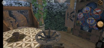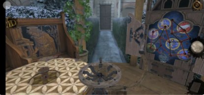 7、然后开启第二道机关,先向右翻转,再向下翻转机关(这里将机关上小球对应后方椅子上较亮的球即可)