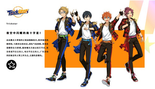 Trickstar由衣更真绪、游木真、明星昴流、冰鹰北斗四位美少年组成,各自在舞台上散发独特光芒: