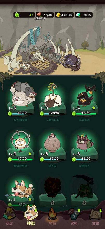 2、神兽:羊9级,尽早召唤进行技能叠伤;仓鼠3级,加快冷却,利用爆发伤害清理悬赏boss以及缓解怪潮带来的压力;小罐猫6级,提供灵魂,用于强化咒术,概率直接强化咒术等级(我比较脸黑一次都没触发也能过);浣熊6级,在前期提供额外的600金币并补充少量伤害;猫头鹰6级,群体控制,延缓怪物进攻节奏;乌鸦随意,前期提供少量金币;狗1级,吉祥物一枚。