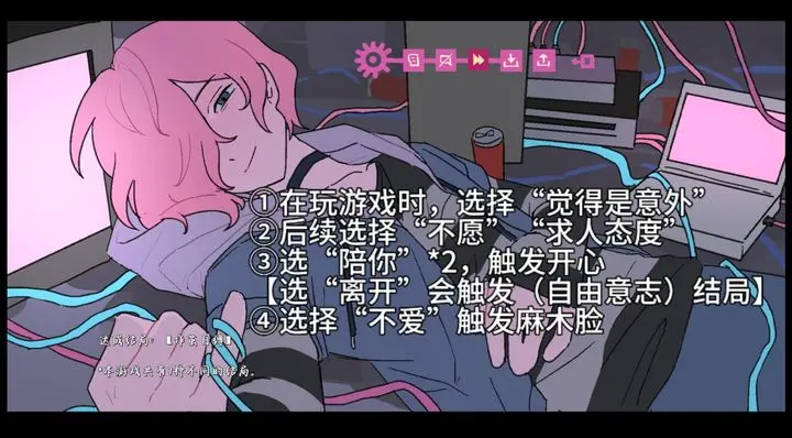 选择“陪你”路线(包含剧情拆分,若在关键节点选择“不爱”,将触发此结局)。