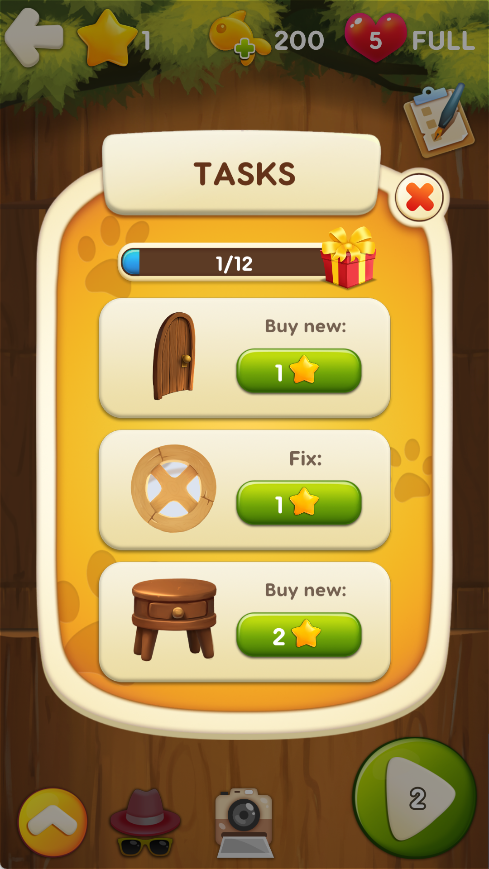 1、初次进入游戏时,你会从一间简陋的小屋开始。完成新手教程后,先按照指引完成基础装修任务,如更换墙纸、地板、家具等,快速熟悉装饰系统。每次装修都会消耗星星,所以要合理规划装修顺序。