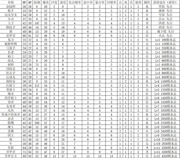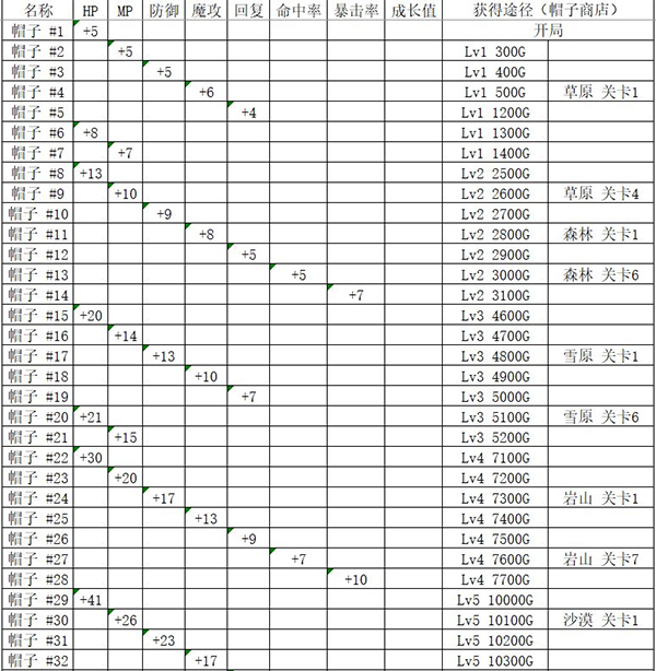 所有帽子均不增加速度、攻击频率、回避率及火、水、雷元素属性。具体成长值请参考下图。