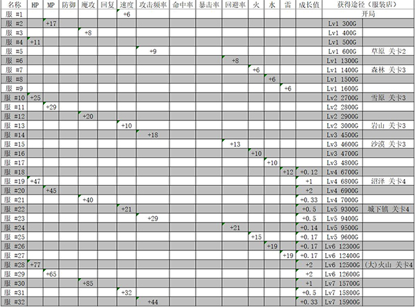 所有衣服均不提供防御、回复、命中率或暴击率加成。推荐选择服 #30,因其在所有衣服中提供最高的魔攻加成。