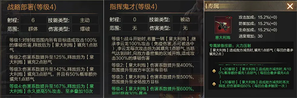 被动技能【指挥鬼才】:提升【意大利炮】的伤害与覆盖范围,增强战场压制力。