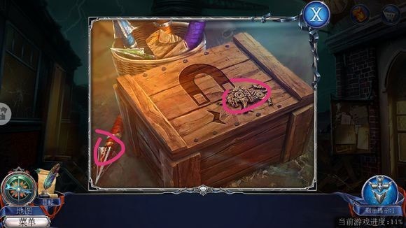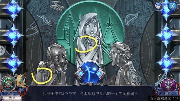 将两个标志安装于大门,根据提示完成小游戏,随后按剧情进入【黑暗之城】(过程中的小游戏按屏幕提示操作即可)。