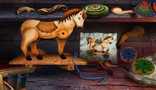 3、最后一个谜题为拼装木马。玩家需按照图示进行组装:将四个轮子分别安装在木板四周,坐垫放置于马背之上,再用蓝色绳子系在马脖子处,完成全部步骤即视为拼装成功。