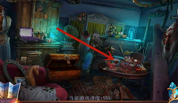 2、寻找红缎带是解开下一关卡的关键。该物品位于桌子上的首饰盒内,打开首饰盒并移开表面的首饰后,即可发现隐藏的红缎带。