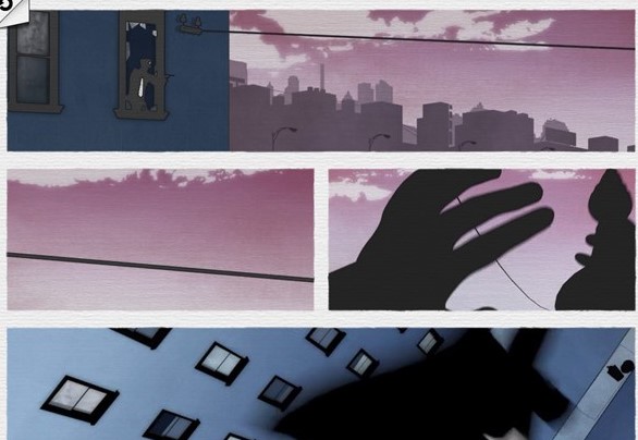 跳出窗外后,主人公利用公文包与绳索滑向对面大楼,但紧追不舍的警察再次开火,导致他中弹坠楼身亡。然而,只需将第2、3幅图交换位置,主人公便能加速滑行,精准躲过子弹,化险为夷。