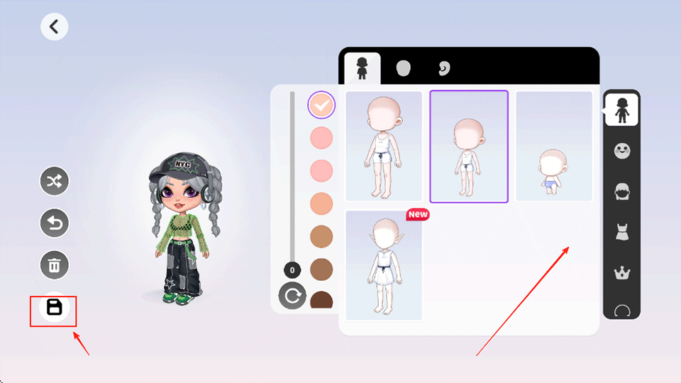 2、在右侧橱窗内为角色进行装扮。装扮完成后记得点击保存,然后点击左上角返回键返回游戏主界面。
