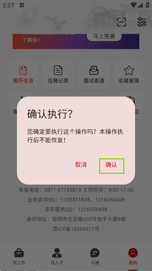 2、系统将弹出“确认执行?”提示框,请仔细阅读说明后点击“确认”(注意:此操作不可逆,简历数据将被永久删除)。