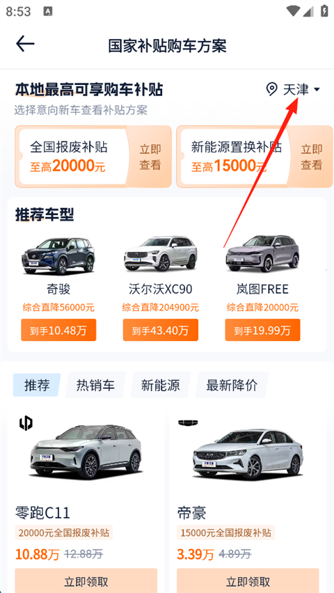 2、进入页面后,选择您当前所在的省市地区,系统将自动展示本地可享受的最高购车补贴额度。