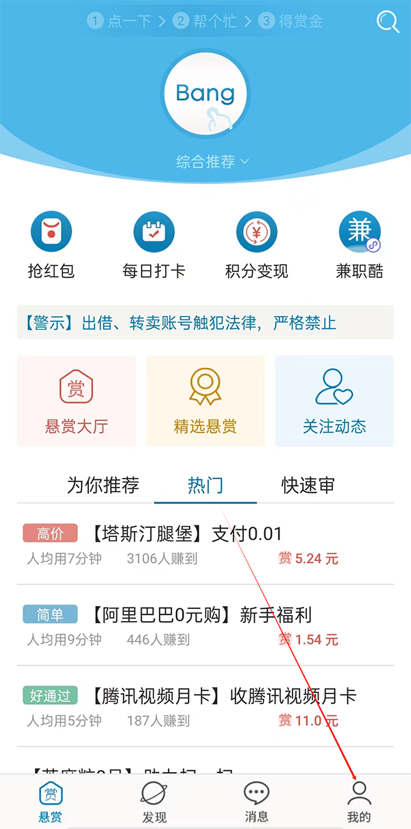 1、下载并打开众人帮兼职App,登录账号后点击底部导航栏中的“我的”。