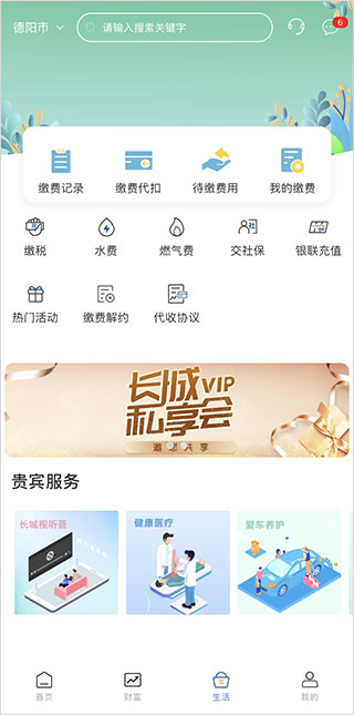 3、“生活”栏目整合了水电费、燃气费、税费、社保等多项缴费入口,一站式解决日常生活缴费需求,省时省力。