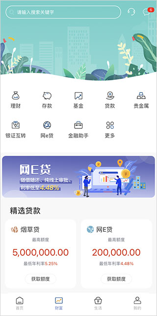 1、打开App后,首页集中展示账户查询、转账汇款、贷款等常用功能,操作入口清晰,便于快速使用。