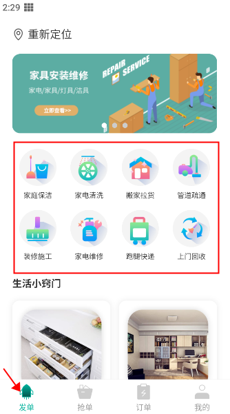 1、打开已下载的应用,点击底部导航栏中的“发单”按钮,在服务列表中选择您需要的服务类型,例如以“家庭保洁”为例进行操作。