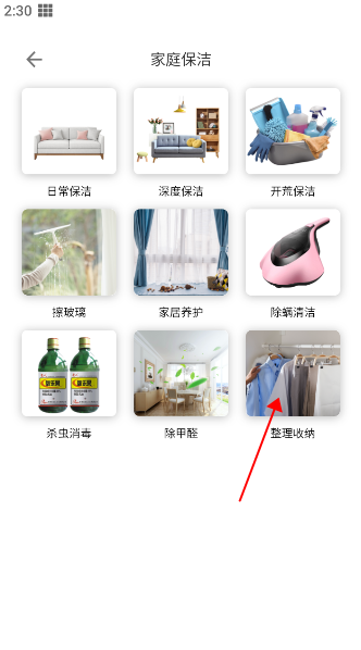 2、在家庭保洁页面中,服务细分为多种类型。若您需要的是整理收纳服务,请点击对应选项进入下一步。